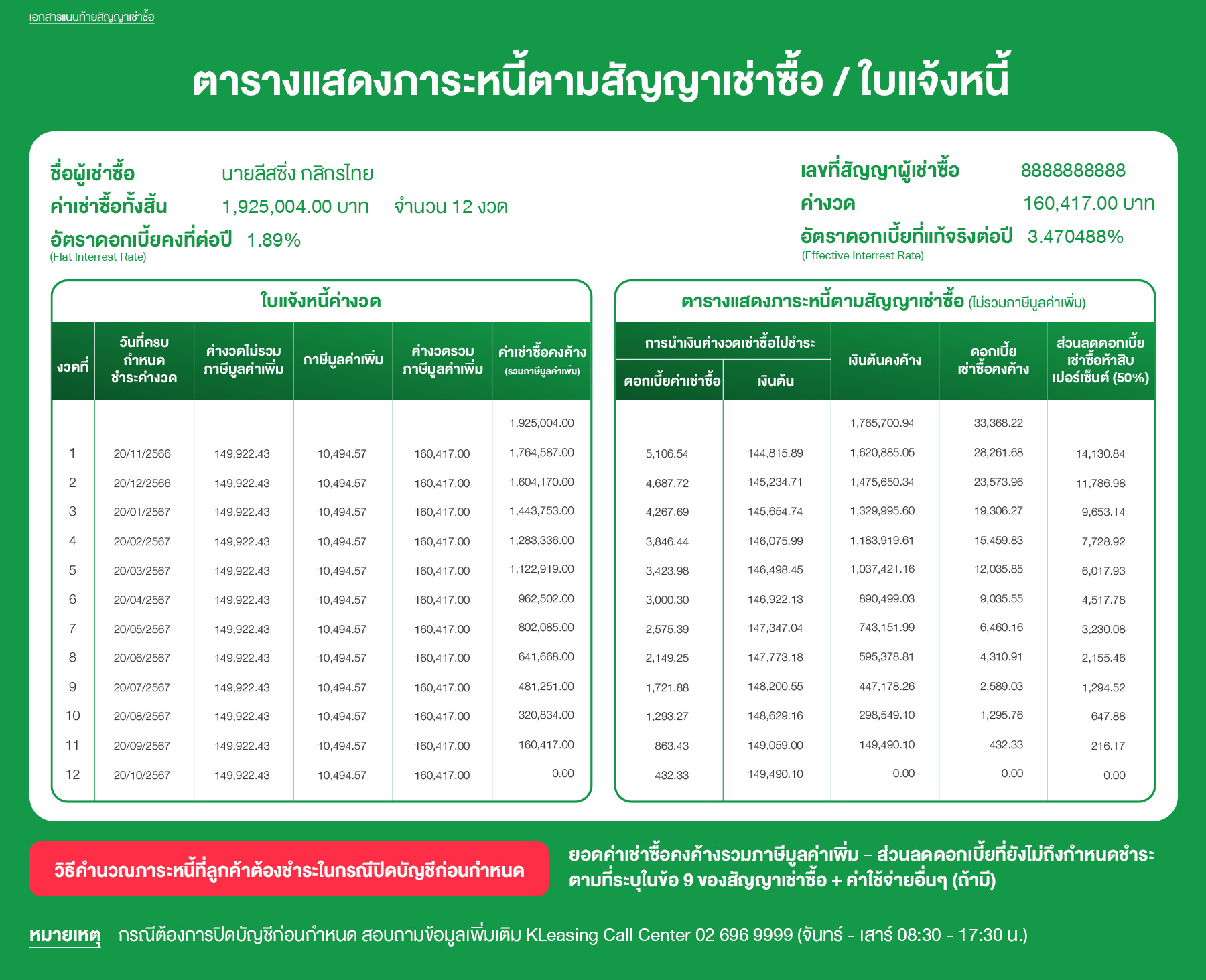 ทั้งนี้ ลูกค้าสามารถดูส่วนลดดอกเบี้ยที่ยังไม่ถึงกำหนดชำระได้จากช่องส่วนลดดอกเบี้ยเช่าซื้อในตารางแสดงภาระหนี้ตาม