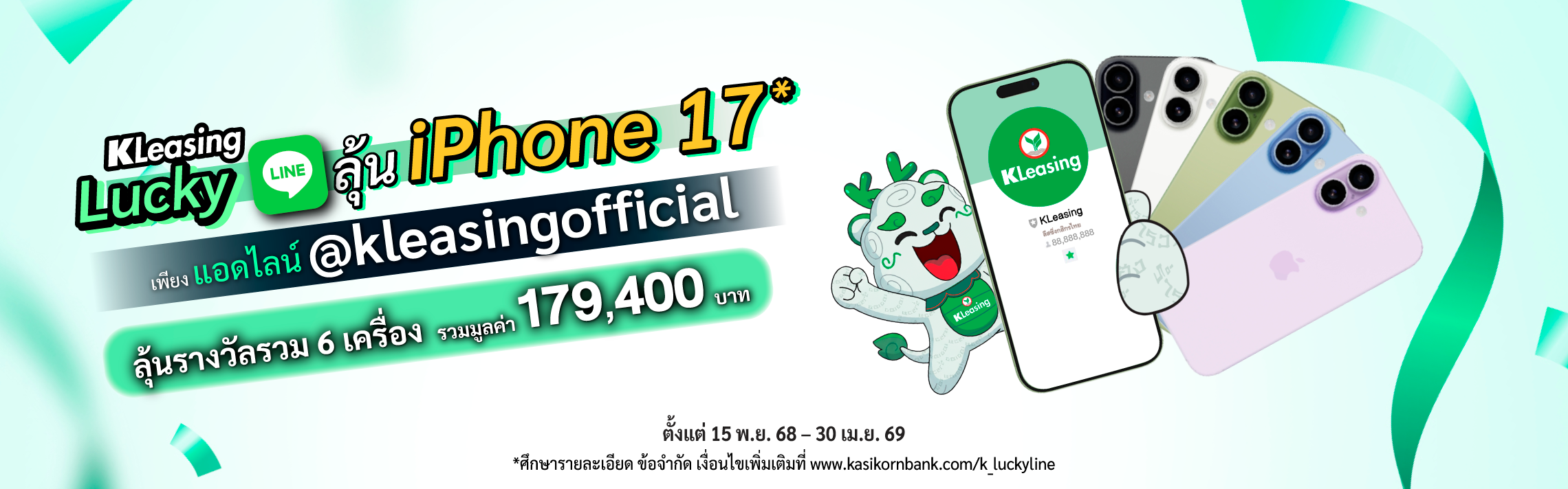 ประกาศรายชื่อผู้ได้รับรางวัลในวันที่ 15 พ.ค. 2569 เวลา 18.00 น. ทางเว็บไซต์ www.kasikornleasing.com และทาง KLeasing LINE Official
